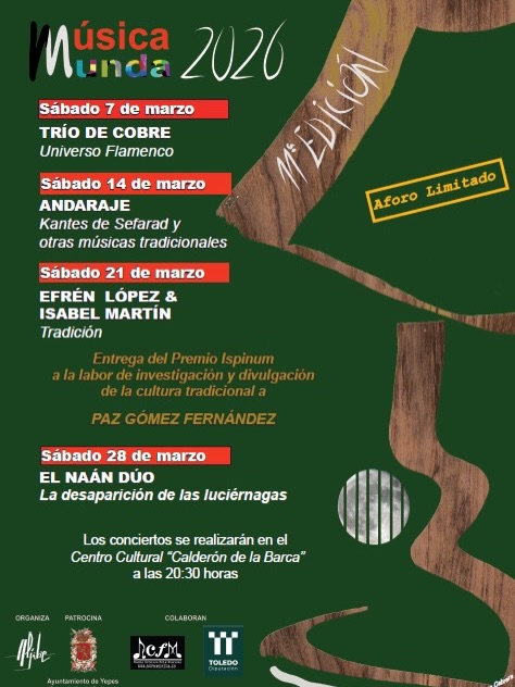 ¡La música vuelve a llenar Yepes de emoción y tradición! El 11º Ciclo de Música Munda ya está aquí y, como cada año, marzo suena mejor que nunca. Todos los sábados del mes, a las 20:30 h, el Centro Cultural “Calderón de la Barca” se convertirá en el epicentro de la música en directo.
