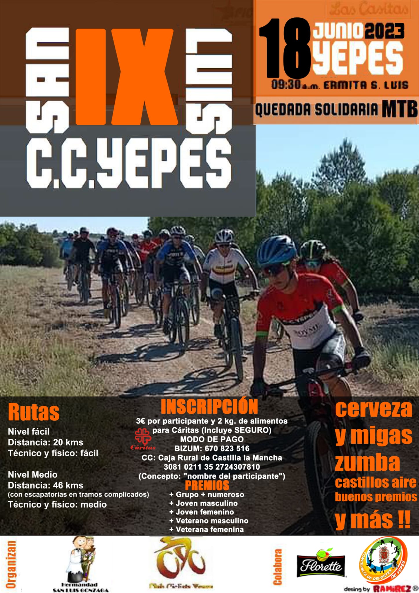 El Domingo 18 de junio darán paso a la Quedada MTB, también de carácter totalmente solidario, con la colaboración inestimable del Club Ciclista de Yepes. Una quedada que este año cumple su 9ª edición, un evento que cuenta cada año con más adeptos. Tendremos migas, zumba, cerveza, castillos, música… y un ambiente solidario 100%.