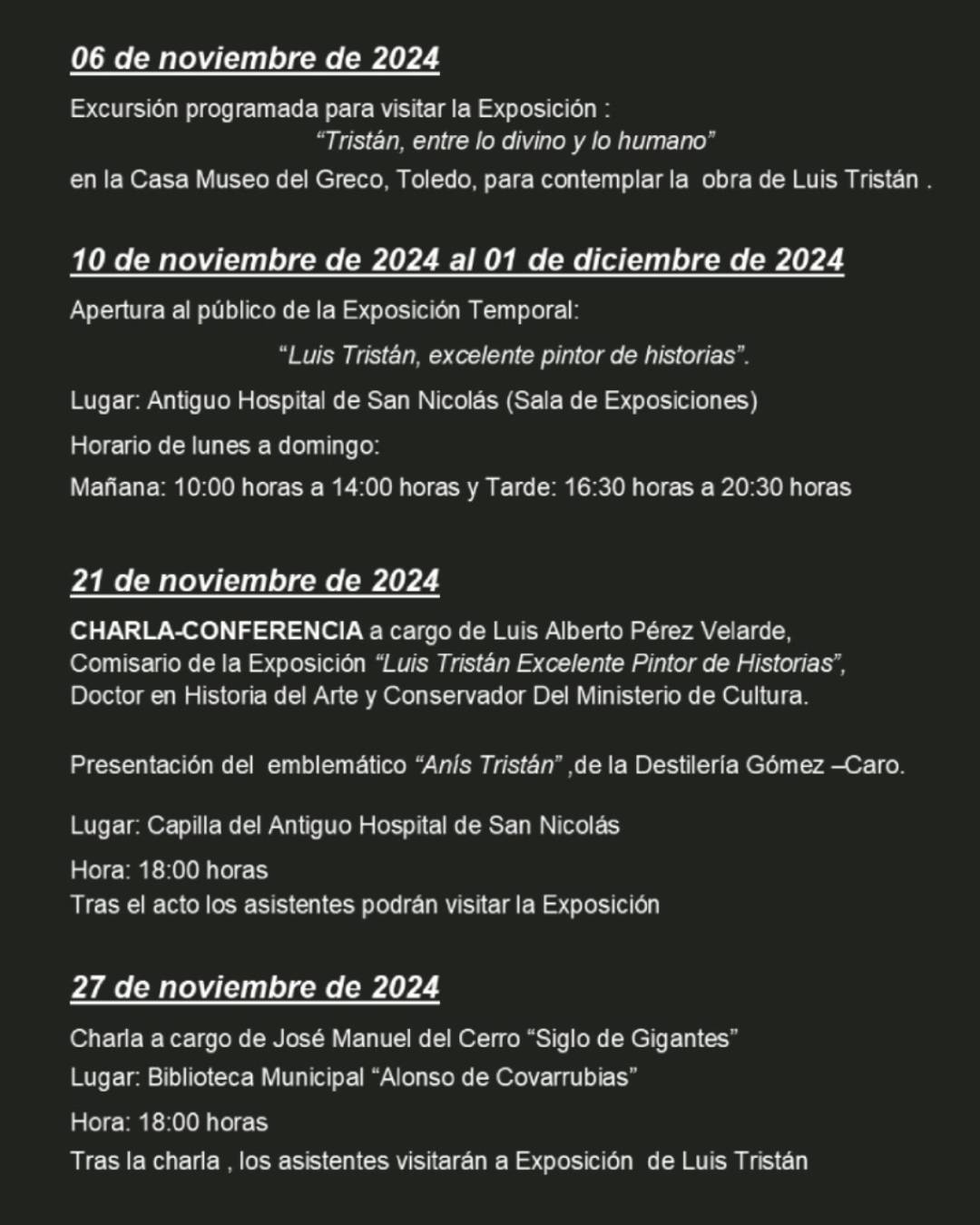 • El 21 de noviembre a las 18:00h en el Antiguo Hospital de San Nicolás tendremos una charla-conferencia a cargo de Luis Alberto Pérez Velarde, comisario de la exposición “Luis Tristán, excelente pintor de historias”. A continuación, se presentará el “Anís Tristán” de la Destilería Gómez-Caro.