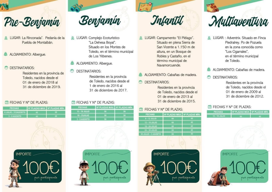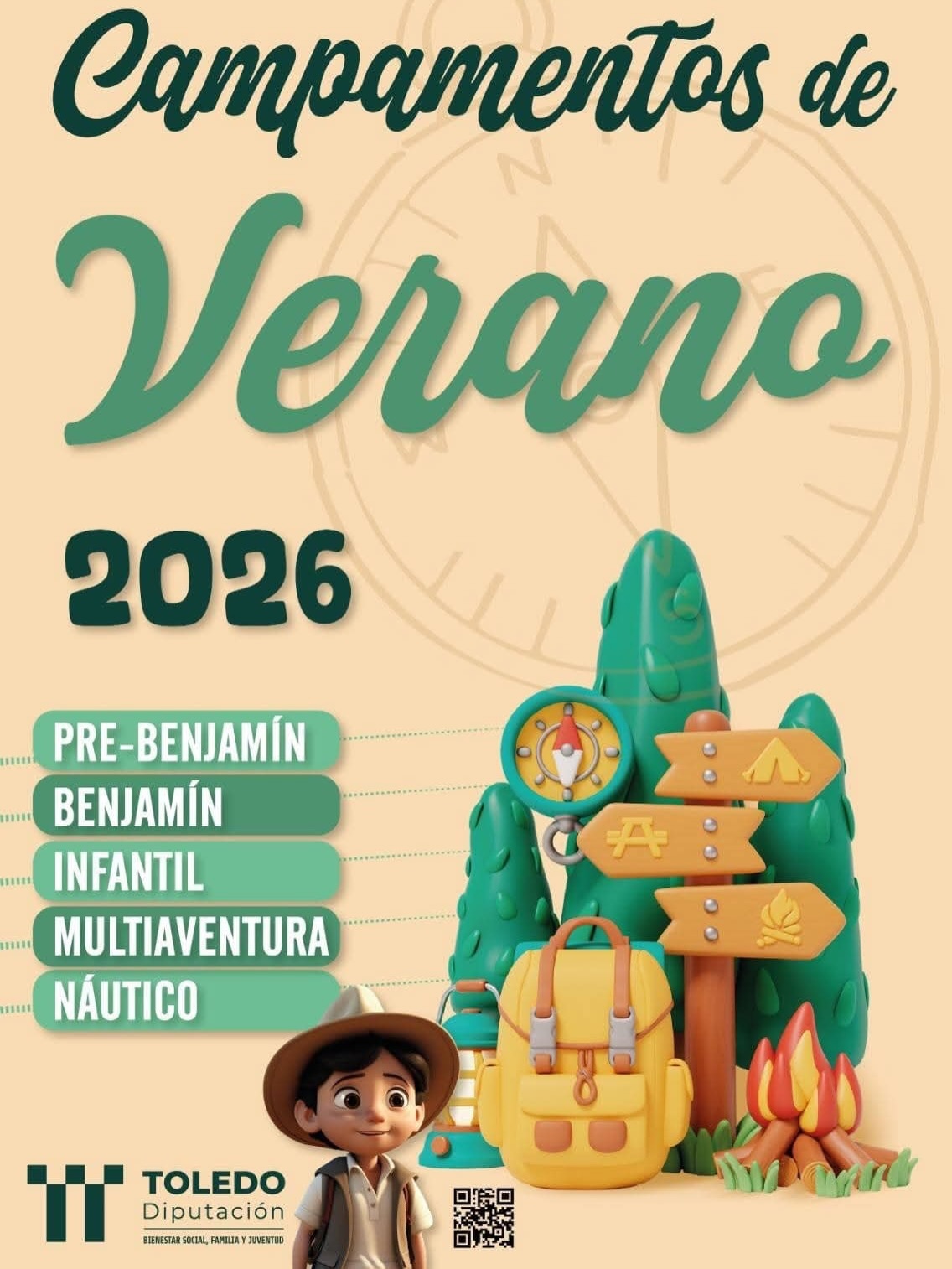 Desde la Concejalía de juventud se informa de que el Área de Bienestar Social, Familia y Juventud de la Diputación de Toledo oferta 700 plazas para los Campamentos de verano 2026 para niños y jóvenes entre 7 y 17 años. El objetivo es que puedan disfrutar de una alternativa de ocio mientras conviven con otros jóvenes de diferentes municipios en un entorno natural. Se han organizado los siguientes campamentos: