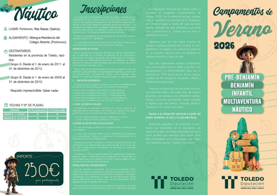 Inscripciones abierta del 1 de febrero al 2 de marzo en https://diputacion.toledo.gob.es/procedimientos_y_servicios en el apartado “Campamento de Verano / Solicitudes Campamento”. También se puede acudir presencialmente a la Diputación de Toledo o a cualquier Administración Pública de la provincia.
