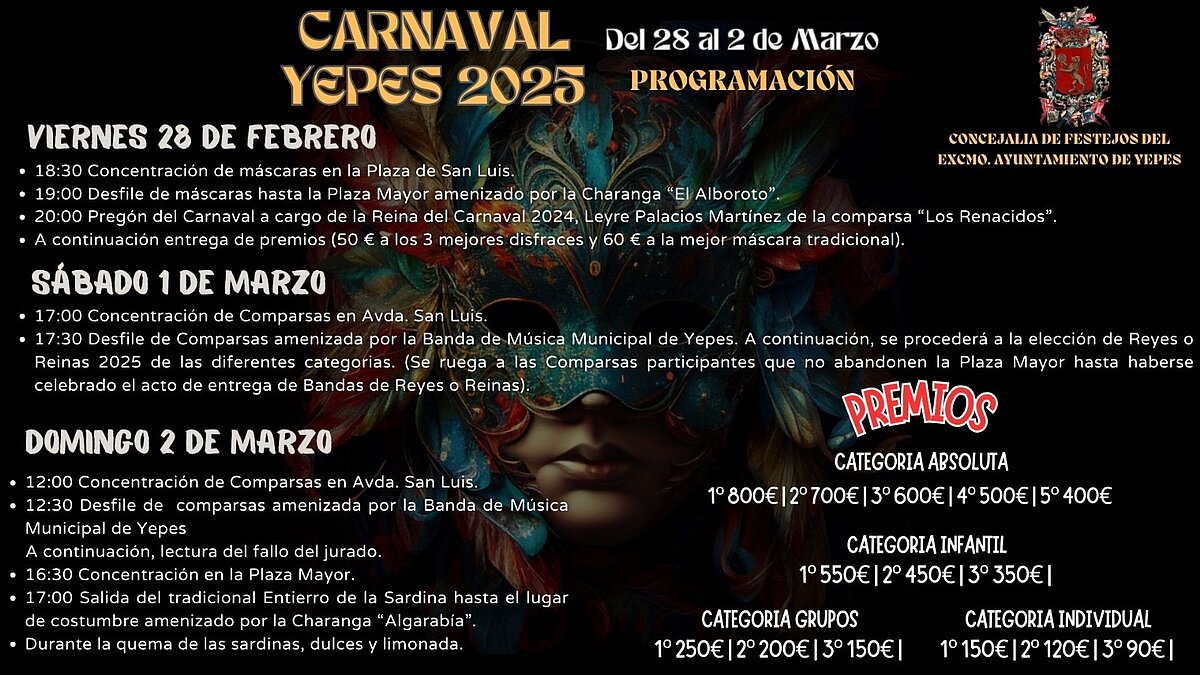 Este año, las actividades se desarrollarán el finde del 28 de febrero al 2 de marzo. Tenéis disponible en esta noticia el programa y las bases del concurso en el siguiente enlace: https://www.yepes.es/noticias/noticia/bases-carnavales-2025; o clicando en el apartado "noticias" de esta misma web.