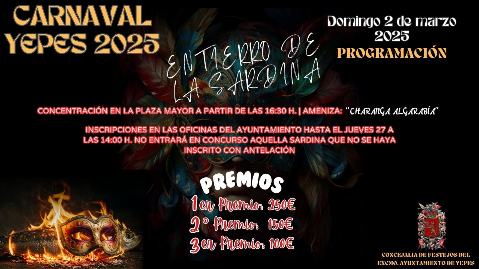 -Domingo 2: concentración de comparsas en Avda. San Luis, desfile amenizado por la Banda de Música Municipal de Yepes hacia la Plaza Mayor, fallo del jurado y salida del tradicional entierro de la sardina hacia el lugar de costumbre amenizado por la charanga “Algarabía”. Finalmente, se entregarán sardinas, dulces y limonada durante la quema.