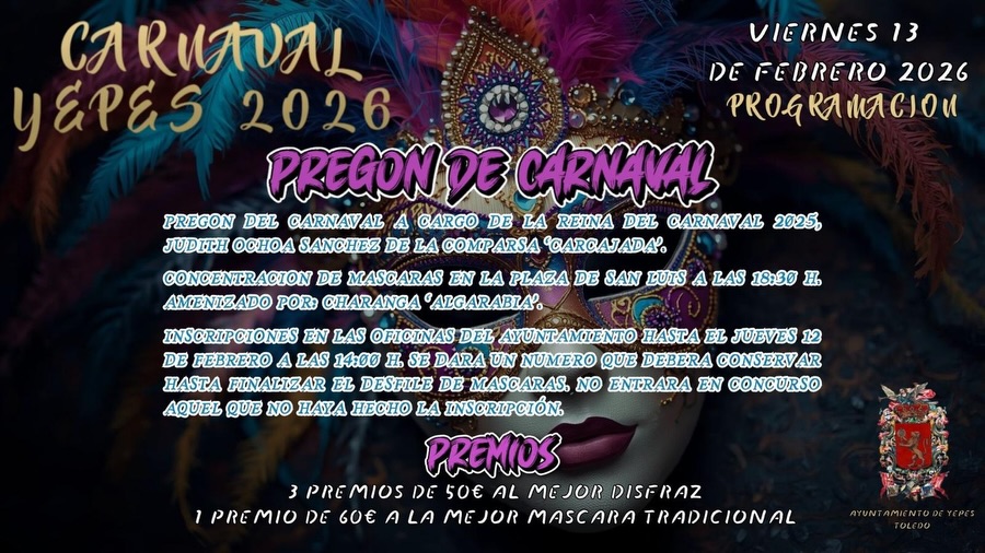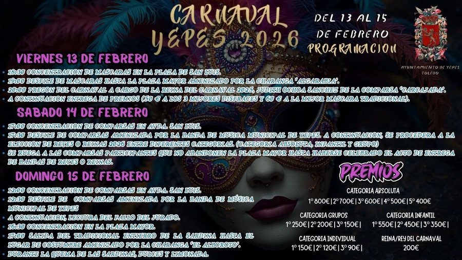 SÁBADO 14: La jornada arrancará con la concentración de comparsas en la Avenida San Luis y el desfile hasta la Plaza Mayor, amenizado por la Banda de Música Municipal de Yepes. Allí se celebrará la elección de reyes y reinas del Carnaval 2026 en sus diferentes categorías. Se ruega a todas las comparsas no abandonar la Plaza Mayor hasta la finalización del acto de entrega de bandas.