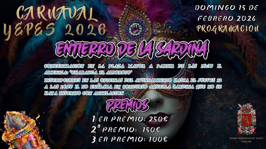 DOMINGO 15: Por la mañana, concentración de comparsas en la Avenida San Luis y desfile hasta la Plaza Mayor con la Banda de Música Municipal de Yepes, donde tendrá lugar el fallo del jurado. Por la tarde, a las 16:30 h, concentración en la Plaza Mayor para dar comienzo al tradicional entierro de la sardina, con salida hacia el lugar habitual, amenizado por la charanga “El Alboroto”. Para finalizar, se repartirán sardinas, dulces y limonada durante la quema.