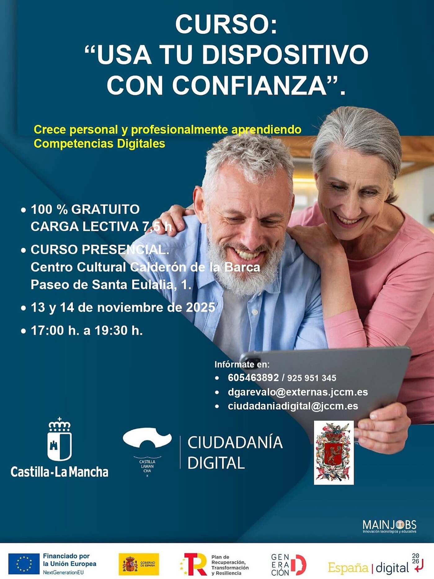 Para inscribiros podéis llamar a los siguientes números de teléfono 605 463 892 / 925 951 345; mandar un correo electrónico a las direcciones dgarevalo@externas.jccm.es / ciudadaniadigital@jccm.es o de forma online en el siguiente enlace: https://ciudadaniadigital.castillalamancha.es/.../usa-tu...