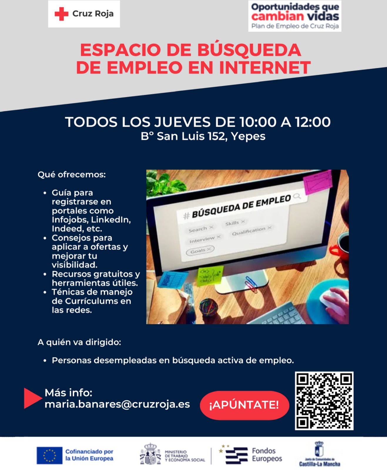 Desde el Ayuntamiento de Yepes informamos de la puesta en marcha del Espacio de Búsqueda de Empleo en Internet, una iniciativa de Cruz Roja enmarcada en su Plan de Empleo “Oportunidades que cambian vidas”, que se desarrollará en nuestra localidad.