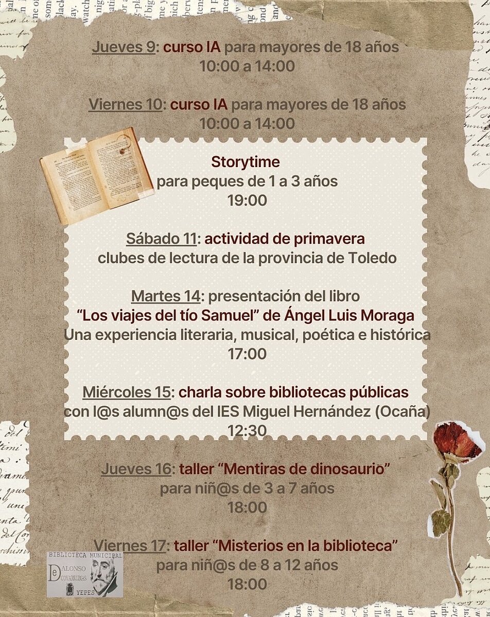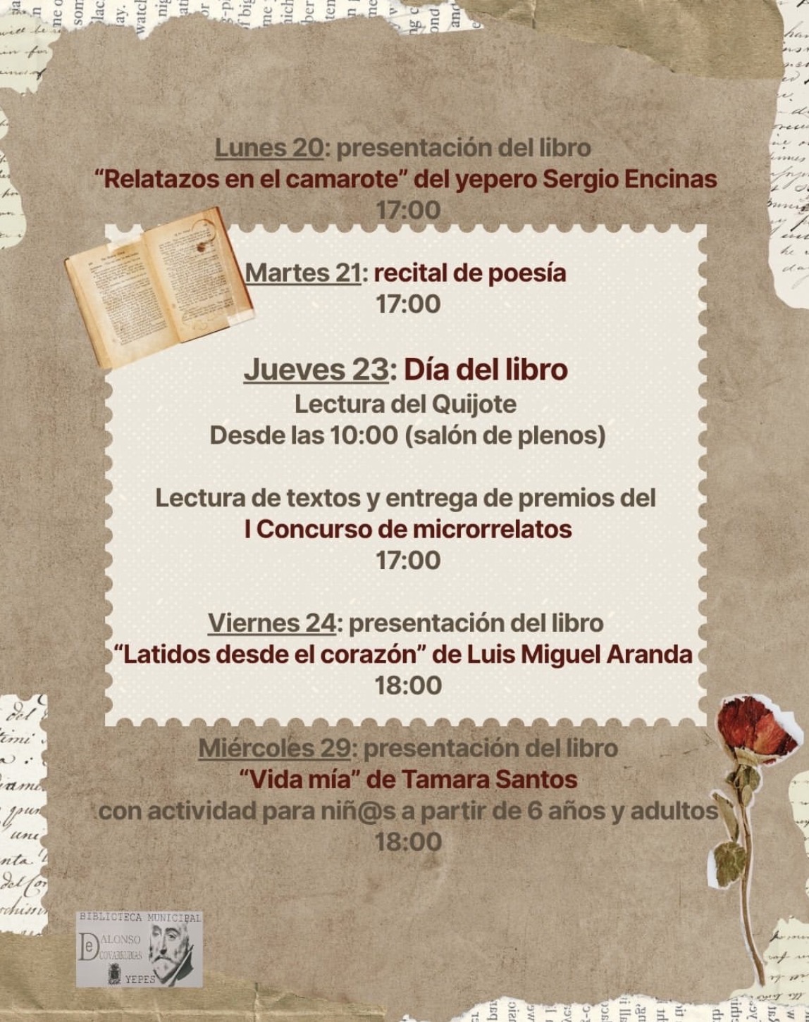 Contaremos con diversas actividades como presentaciones de libros, talleres de lectura infantiles, recital de poesía, charlas sobre bibliotecas públicas, nuestra tradicional lectura de El Quijote…¡Ven y celebra el mes del libro en Yepes!