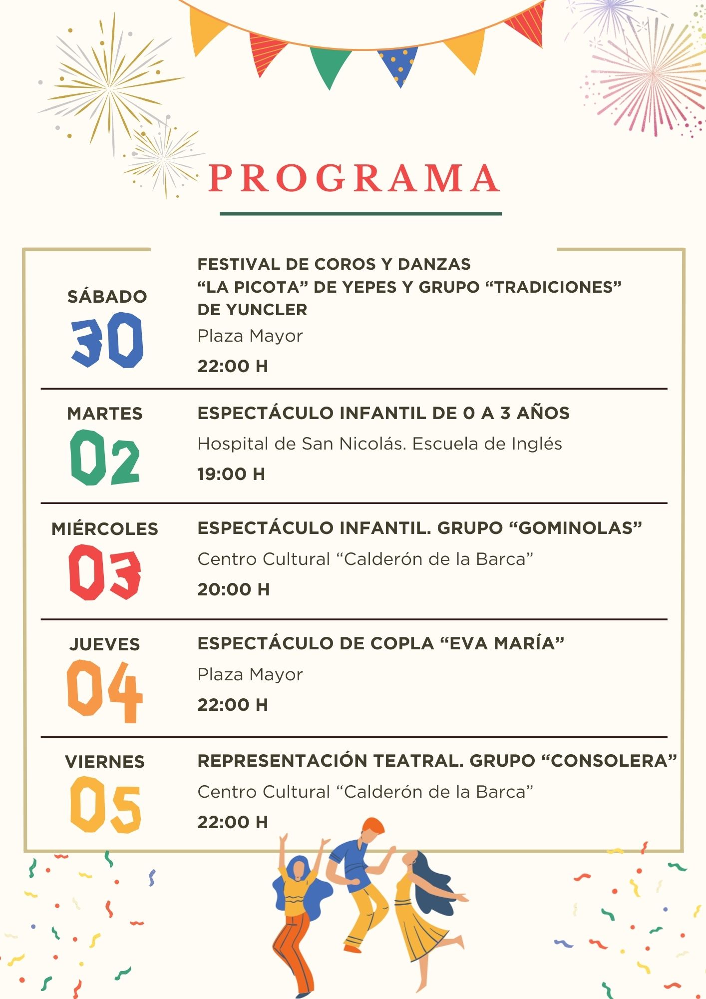 De esta forma, desde el Ayuntamiento de Yepes pretendemos aproximar la cultura y hacer disfrutar con ella en todas sus manifestaciones a todos los públicos de nuestra localidad con el festival de coros y danzas, espectáculos teatrales y de danza para niños y adultos, exposiciones de pintura, concurso de DJs locales, la tercera edición de “Me suena tu cara”… ¡Ven y disfruta con nosotros!